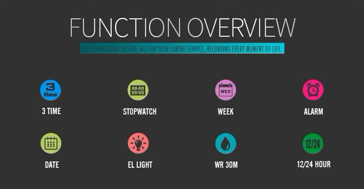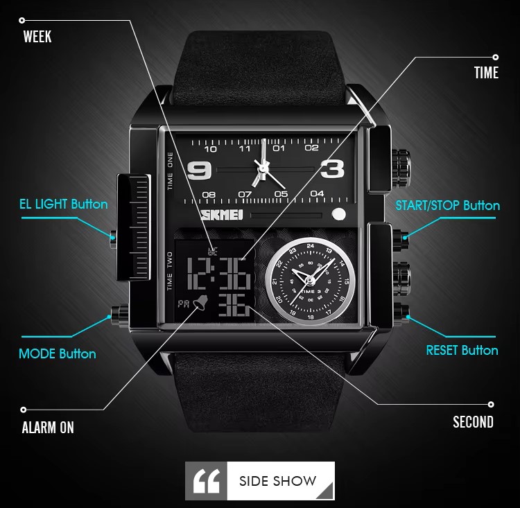 Features: | 3 Time, Chronograph (stopwatch), Date, Day, Alarm, Week, Led Light, 12/24-Hour Clock, Anti Magnetic, Analog+Digital |