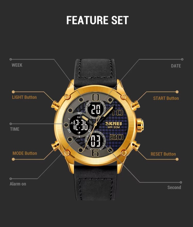 Features: 3 Time, Chrono, Date, Week, El Light, Count down Timer, Analog + Digital Display, Bezel Rotation, 12/24 Hour Clock Anti Magnetic