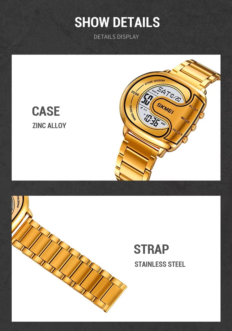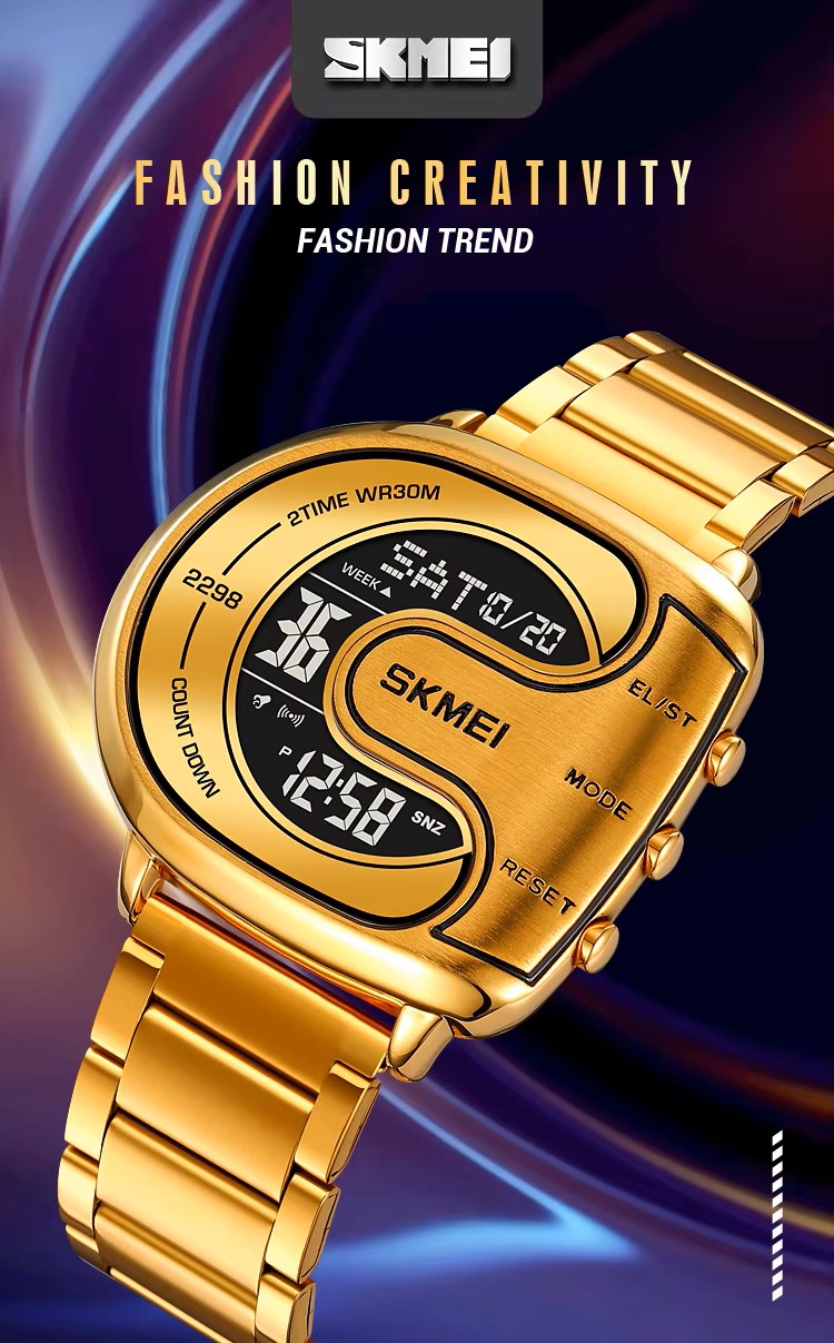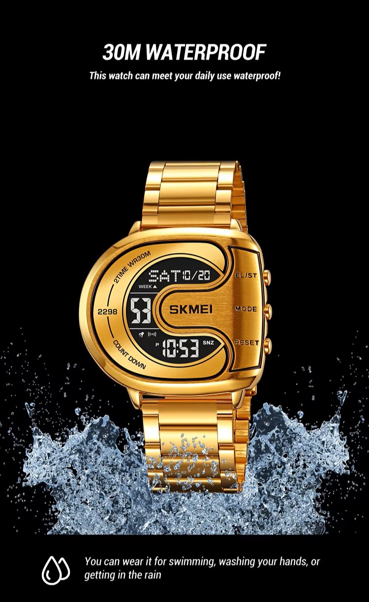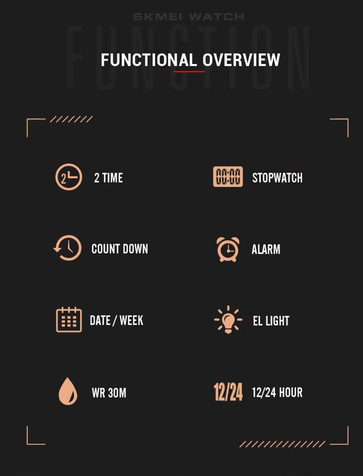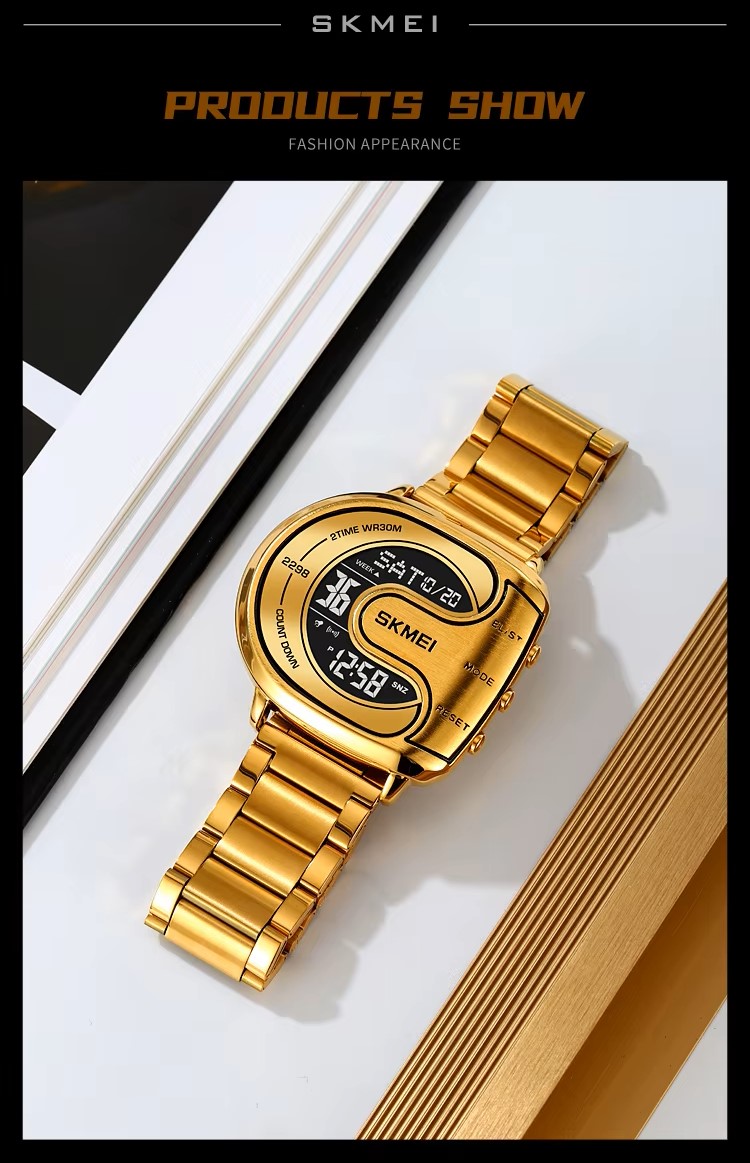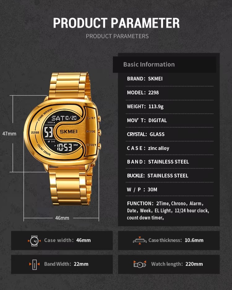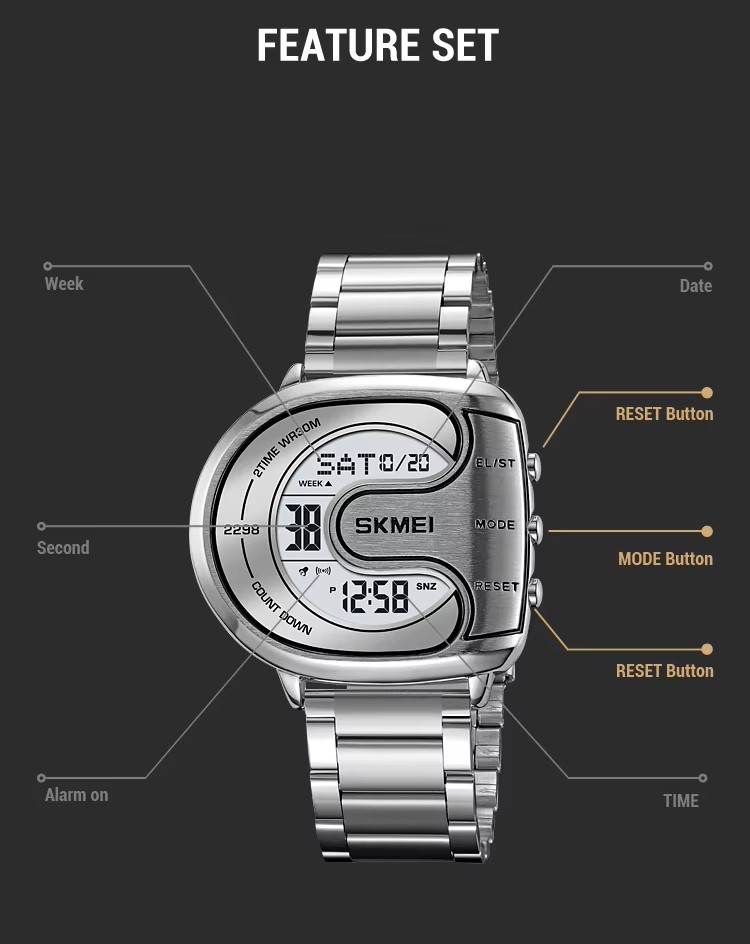 | Features: | 2 Time, Chrono. Alarm, Date, Week, EL Light, Countdown Timer, 12/24 Hour Clock, Anti Magnetic |